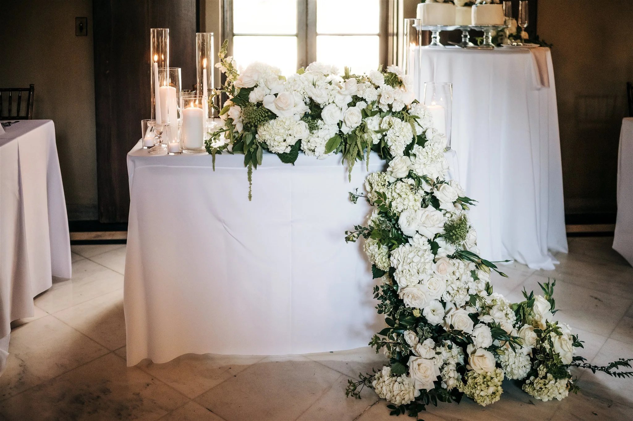 - Sweetheart Table: Most of our couples opt for a sweetheart table for their reception seating. This is often set up near the 2 sets of stairs and in between the stone urns.